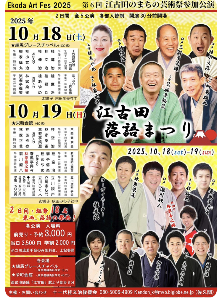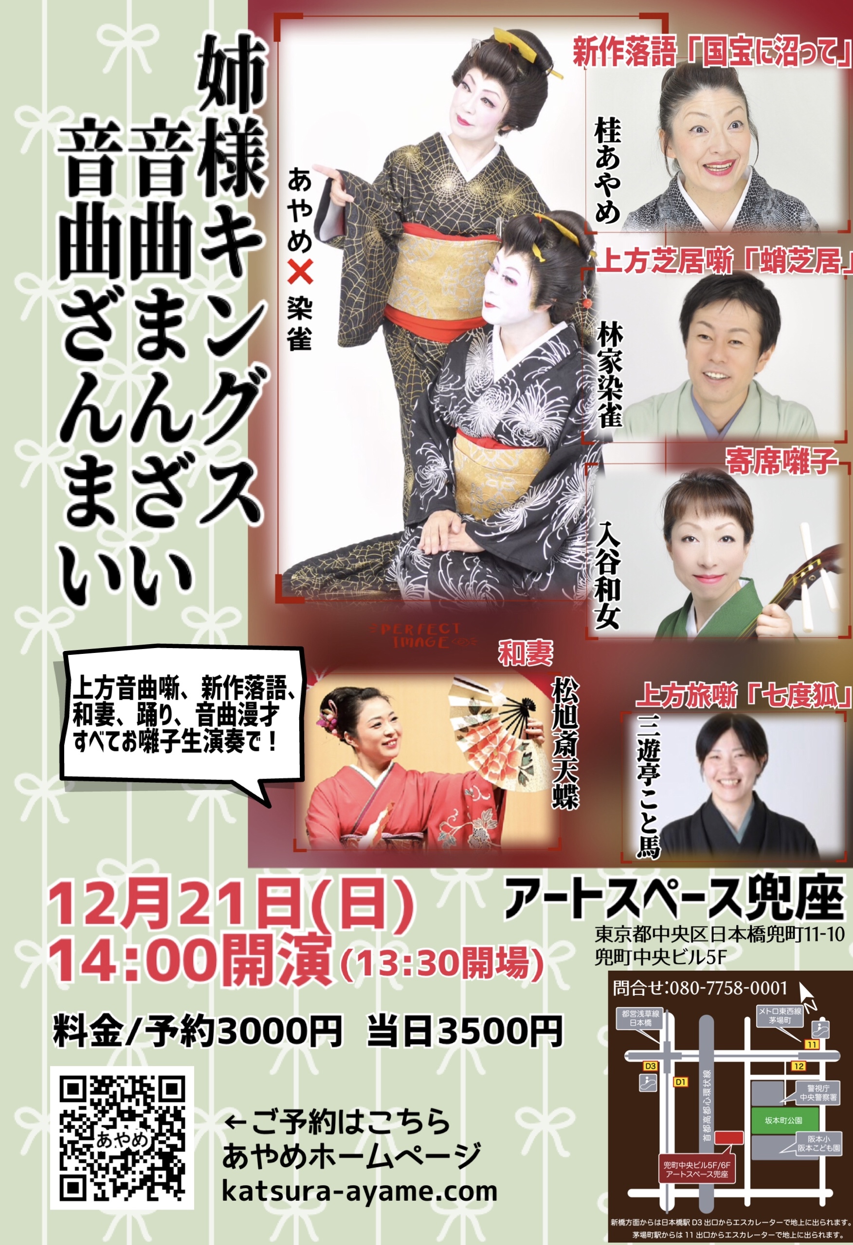 出演者 | 姉様キングス(あやめ、染雀) 桂あやめ「国宝に沼って」 林家染雀「蛸芝居」 三遊亭こと馬「七度狐」 和妻/松旭斎天蝶 三味線/入谷和女 |