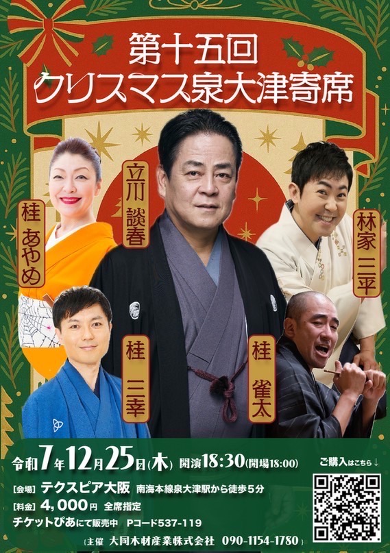 出演者 | 歳末吉例女流大会ウィーク 12月1日(月) 桂おとめ※/露の陽照/露の瑞(のこぎり演奏)/月亭天使/内海英華(女道楽)/露の紫~仲入~露の眞/桂あやめ/松旭斎天蝶(和妻)/露の都 12月2日(火) 桂米舞/桂文りん/桂ぽんぽ娘(メイド漫談)/露の団姫/内海英華(女道楽)/露の眞~仲入~桂鞠輔/露の都/松旭斎天蝶(和妻)/桂三扇 12月3日(水) 桂文りん/月亭八織※/露の眞(どじょうすくい)/露の都/内海英華(女道楽)/桂ぽんぽ娘~仲入~露の瑞/桂三扇/松旭斎天蝶(和妻)/桂あやめ 12月4日(木) 桂米舞/桂おとめ/桂文りん(マイクパフォーマンス)/桂三扇/内海英華(女道楽)/露の団姫~仲入~露の紫/桂あやめ/松旭斎天蝶(和妻)/露の都 12月5日(金) 桂おとめ/露の瑞/露の陽照(ものまね)/露の紫/内海英華(女道楽)/月亭天使~仲入~露の眞/露の都/松旭斎天蝶(和妻)/桂あやめ 12月6日(土) 桂米舞/月亭天使/月亭八織(お笑いヨガ)/桂鞠輔/内海英華(女道楽)/桂三扇~仲入~桂ぽんぽ娘/桂あやめ/松旭斎天蝶(和妻)/露の都 12月7日(日) 桂米舞/桂おとめ/露の紫(南京玉すだれ)/桂ぽんぽ娘/内海英華(女道楽)/桂鞠輔~仲入~月亭八織/露の都/松旭斎天蝶(和妻)/桂あやめ |