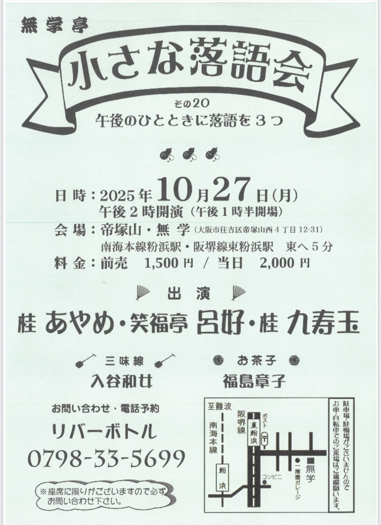 出演者 | 桂九の一、桂二葉、ラッキー舞、月亭八方 仲入り 桂かい枝、桂あやめ、笑福亭松喬 |