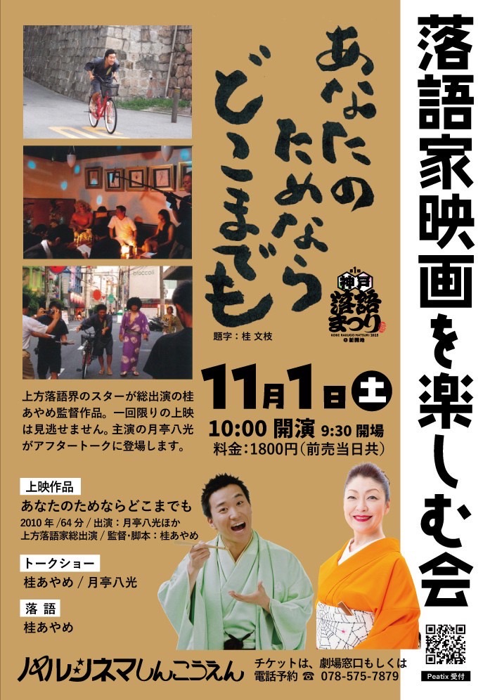 出演者 | 落語/桂あやめ 映画/「あなたのためならどこまでも」2009桂あやめ監督 アフタートーク/月亭八光 桂あやめ 予約/078-575-7879 パルシネマ窓口で販売しています。 |